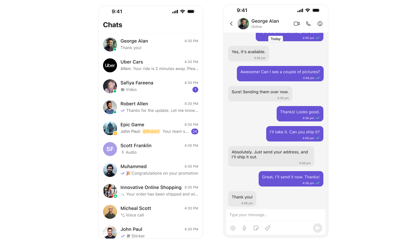 - Chat Header – Displays user or group name, avatar, and back button.